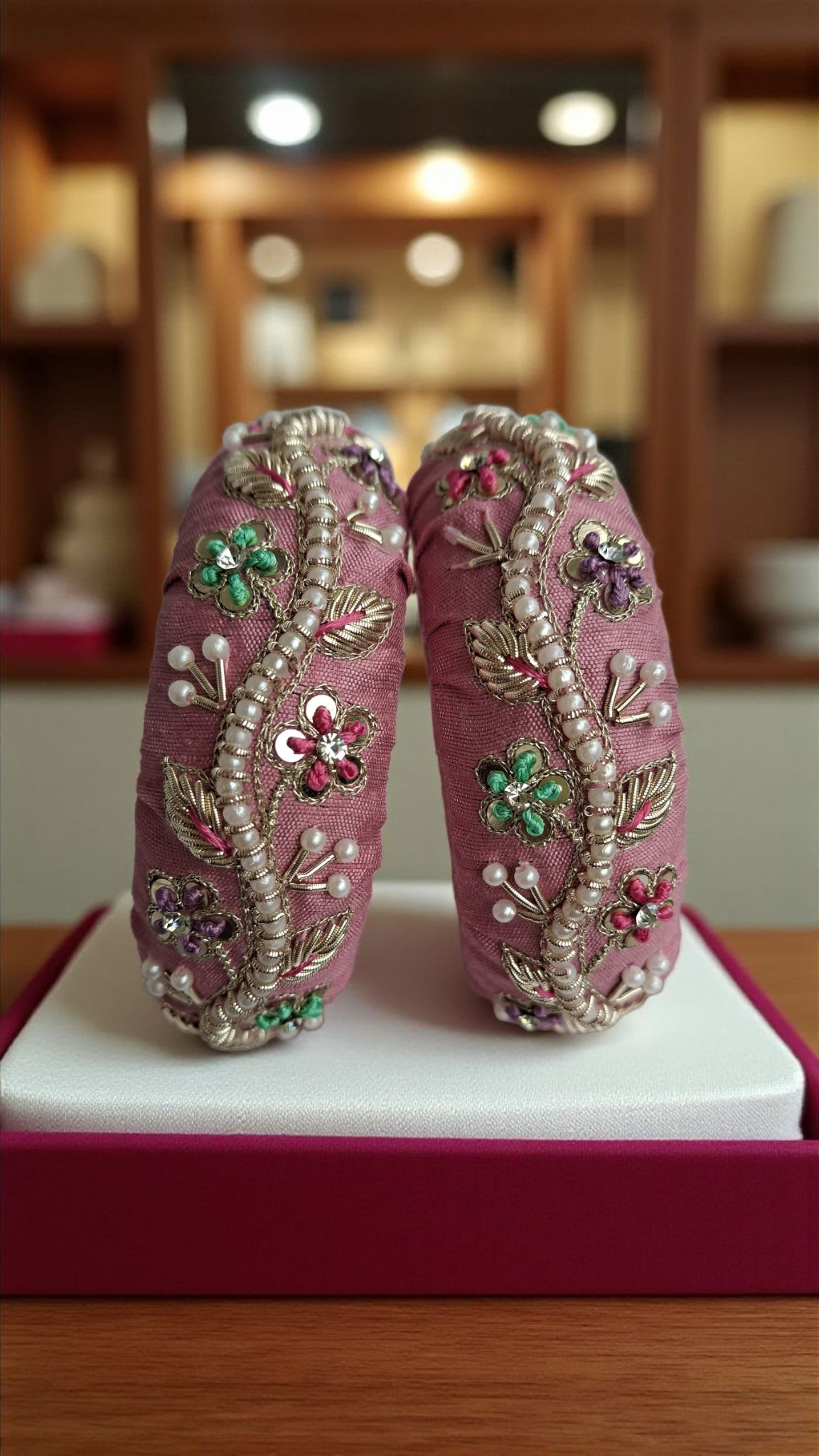 Designed on a soft mauve-pink base, they feature colorful floral motifs adorned with pearls, sequins, and zari work 🌺.