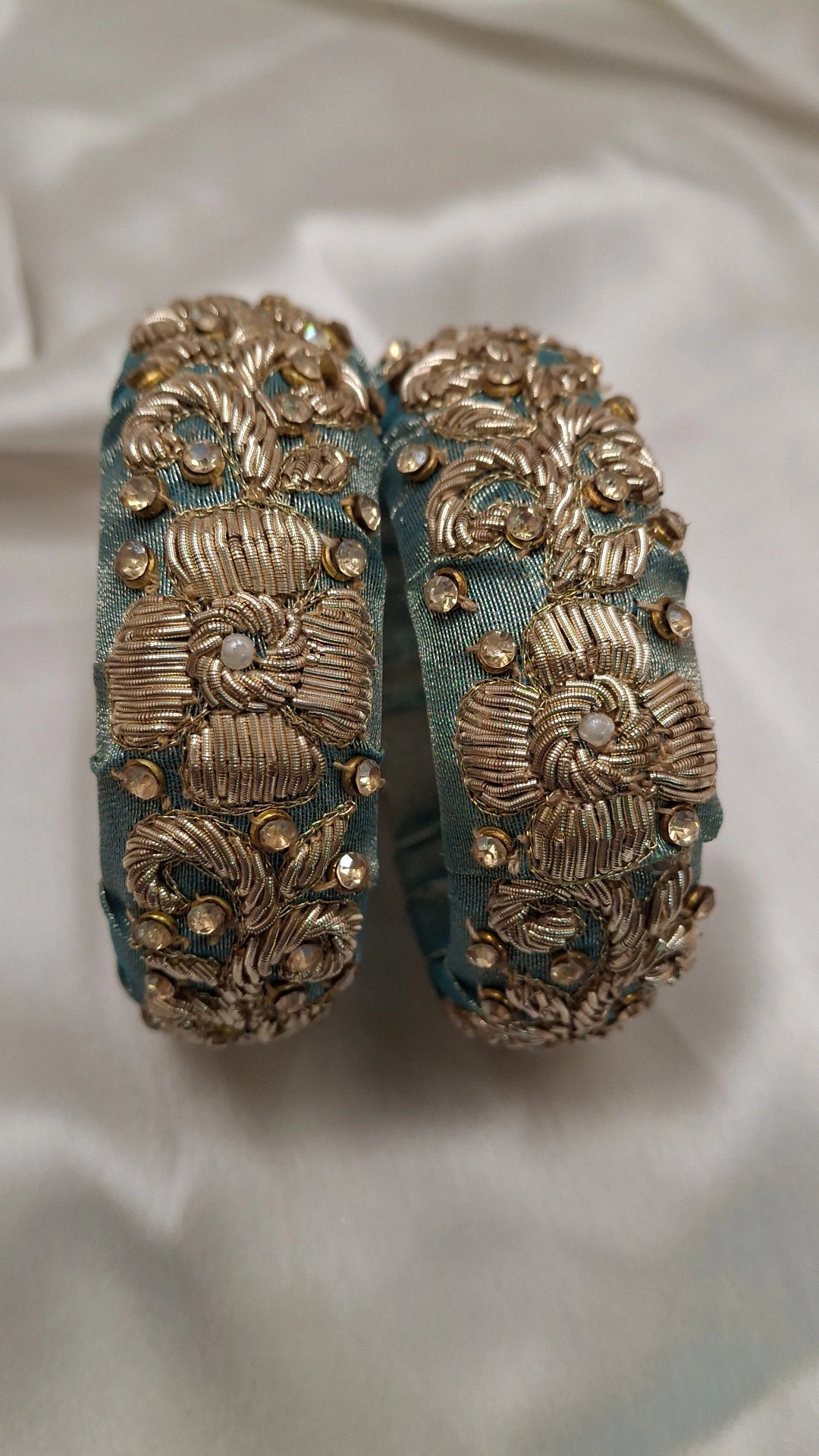 Handcrafted with delicate golden zardozi embroidery and crystal embellishments, these bangles radiate elegance. The soft sky-blue base brings a refreshing charm, perfect for festive wear, weddings, or evening celebrations. 🌸